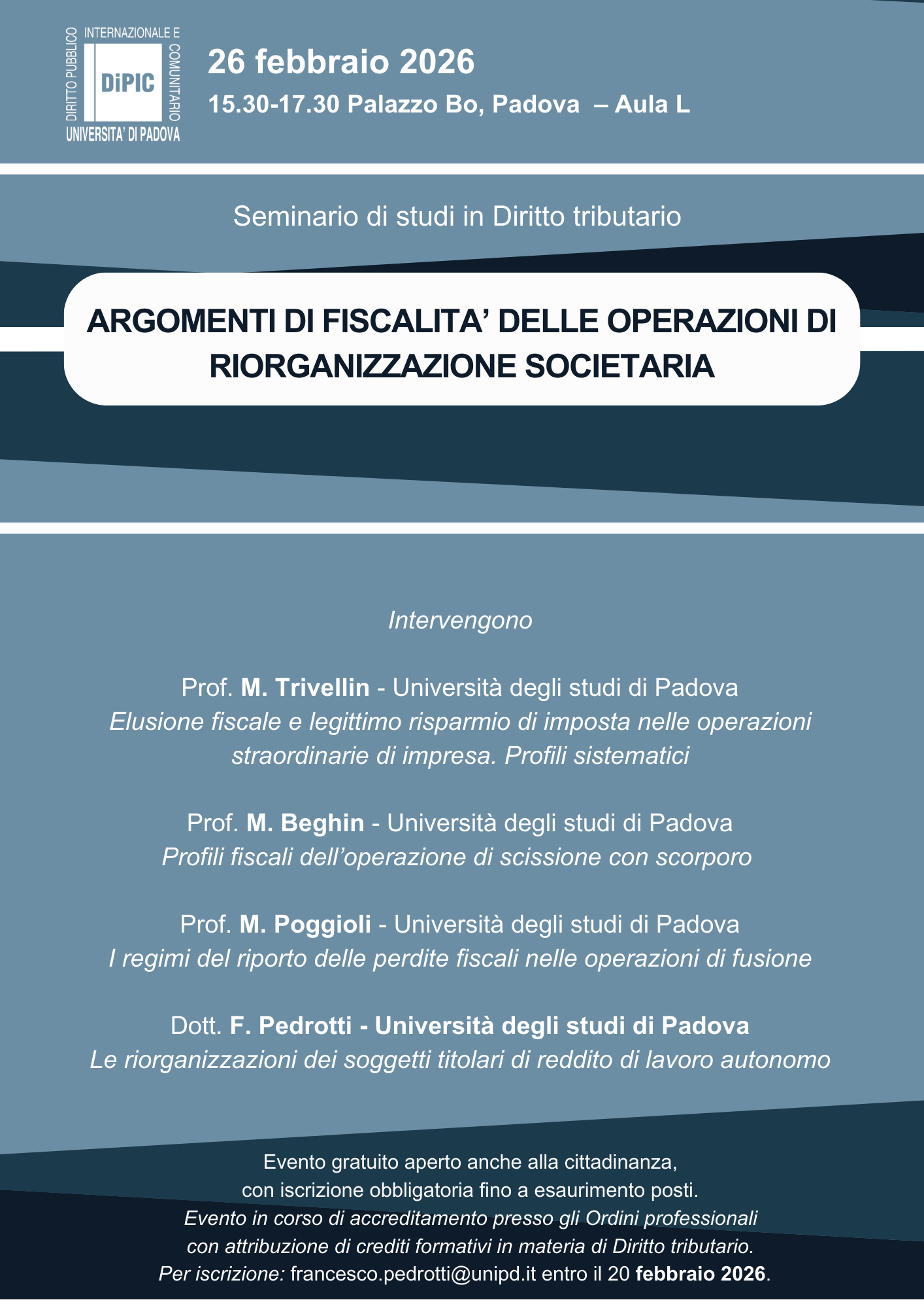 Seminario di studi in Diritto tributario dedicato ai profili fiscali delle operazioni di riorganizzazione societaria, con focus sugli aspetti interpretativi e applicativi di maggiore rilevanza per professionisti e studiosi.